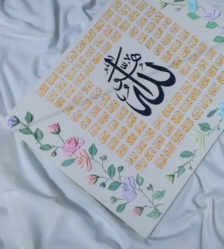 Faith in full bloom. 🌸 A unique piece where sacred calligraphy meets a garden of pastel textures. #HandmadeWithLove