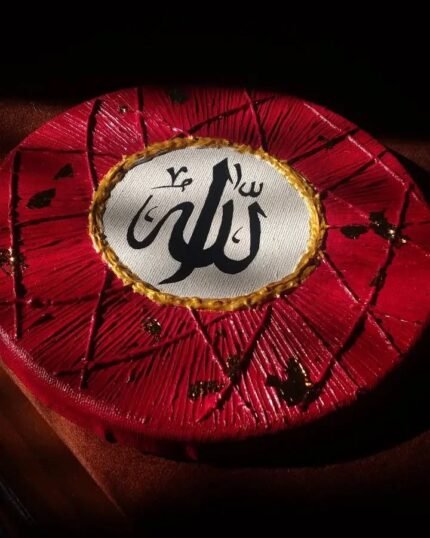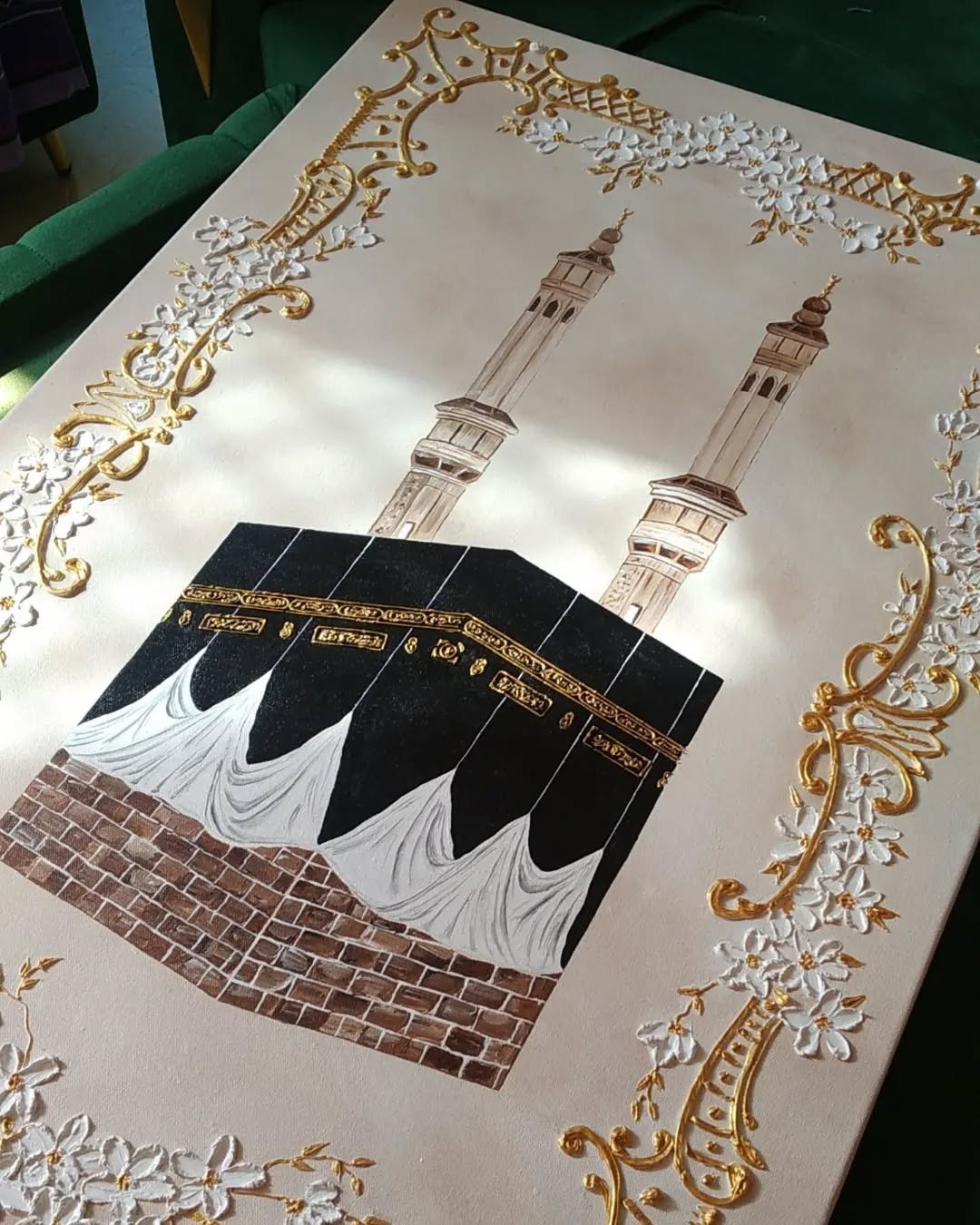 Reverent Central Painting Features a beautifully detailed, hand-painted depiction of the Holy Kaaba and the minarets of the Masjid al-Haram in Makkah.