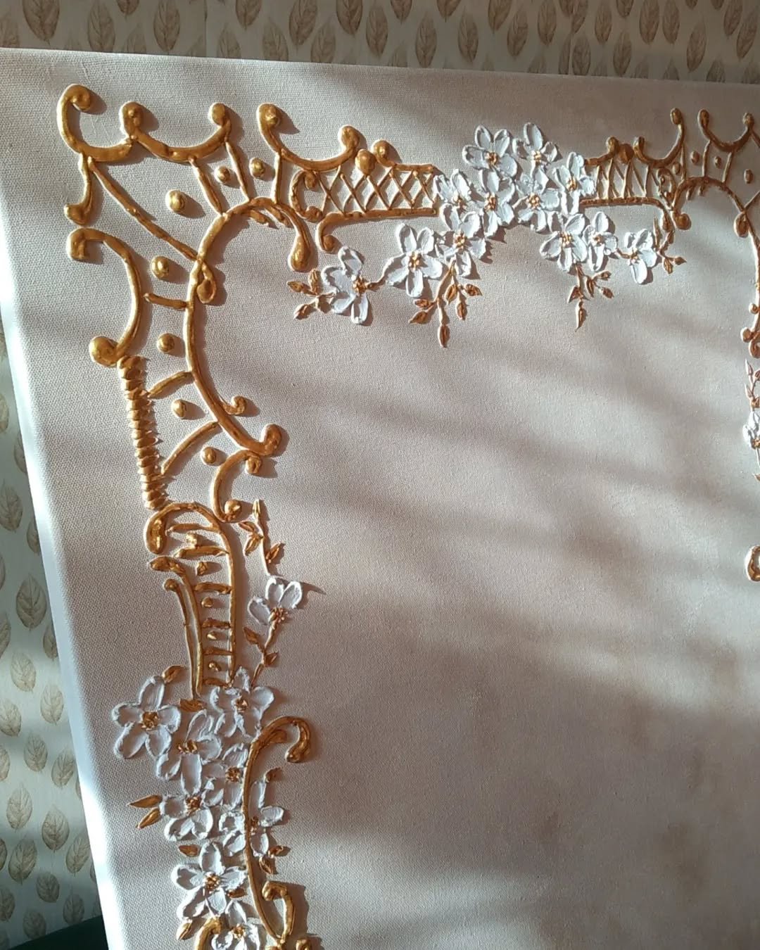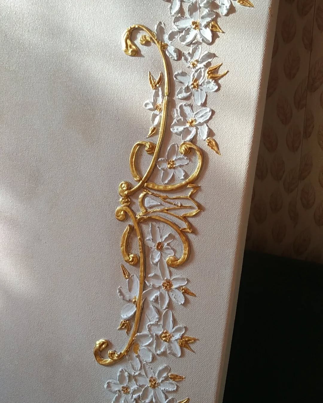 Opulent 3D Floral & Gold Frame The entire piece is encased in a luxurious, hand-applied border of baroque-style gold relief and delicate, three-dimensional white flowers.
