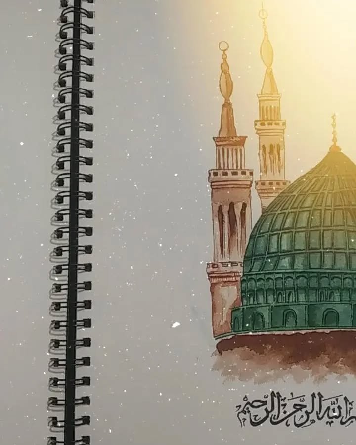 Immerse your space in a gentle shower of blessings with this exquisite watercolor painting of the Prophet’s Mosque. This artwork is a serene and heartfelt tribute, capturing the iconic Green Dome and its minarets as if they are emerging from a beautiful, earthy wash of color.