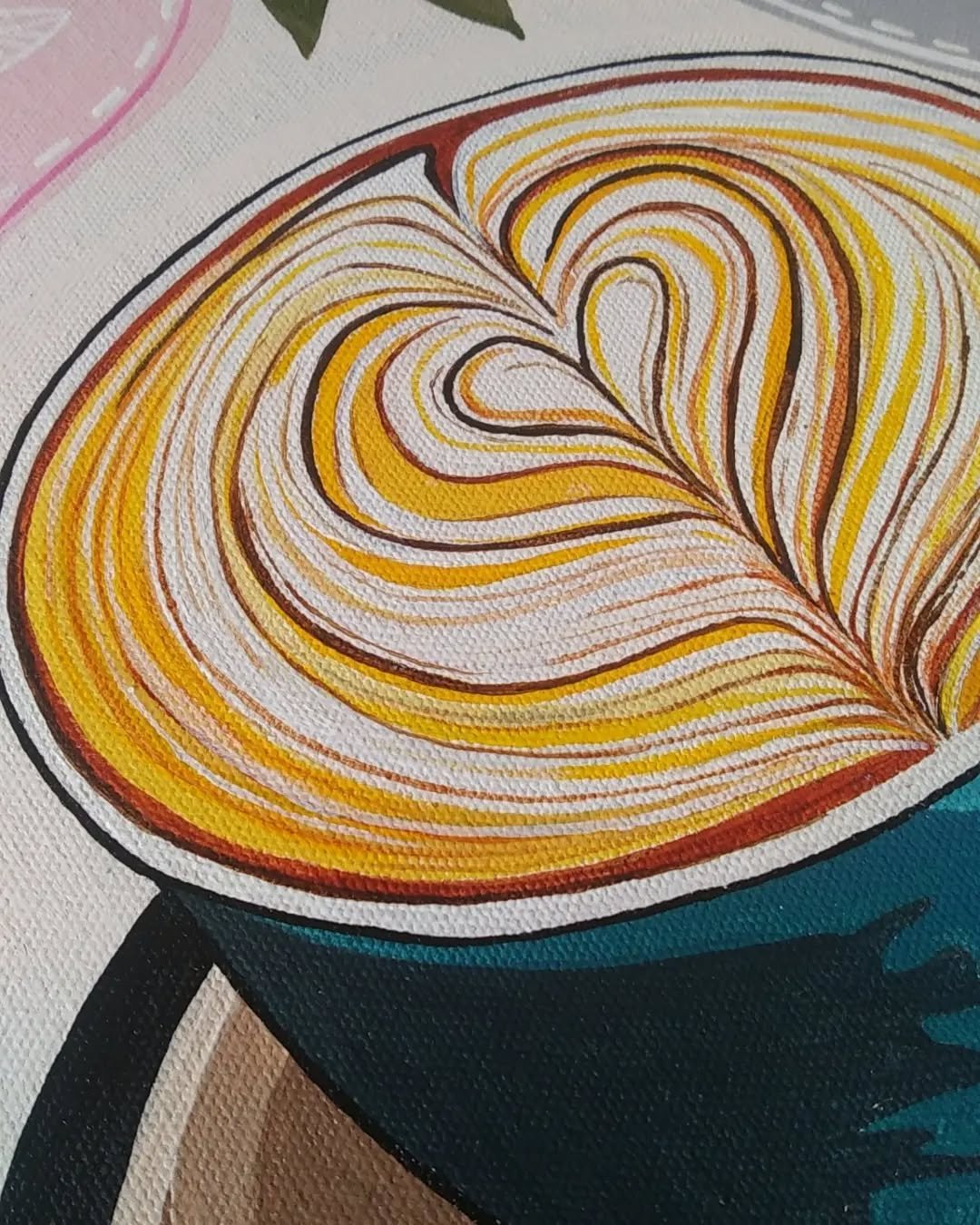 The centerpiece is a vibrant teal mug filled with meticulously detailed, heart-shaped latte art, so rich you can almost smell the aroma. The painting’s modern, illustrative style—with its abstract shapes in soft pinks and greys, and fresh botanical motifs—creates a contemporary and cheerful aesthetic. This is not a generic print; every brushstroke is visible, giving the piece a unique character and artisanal warmth.