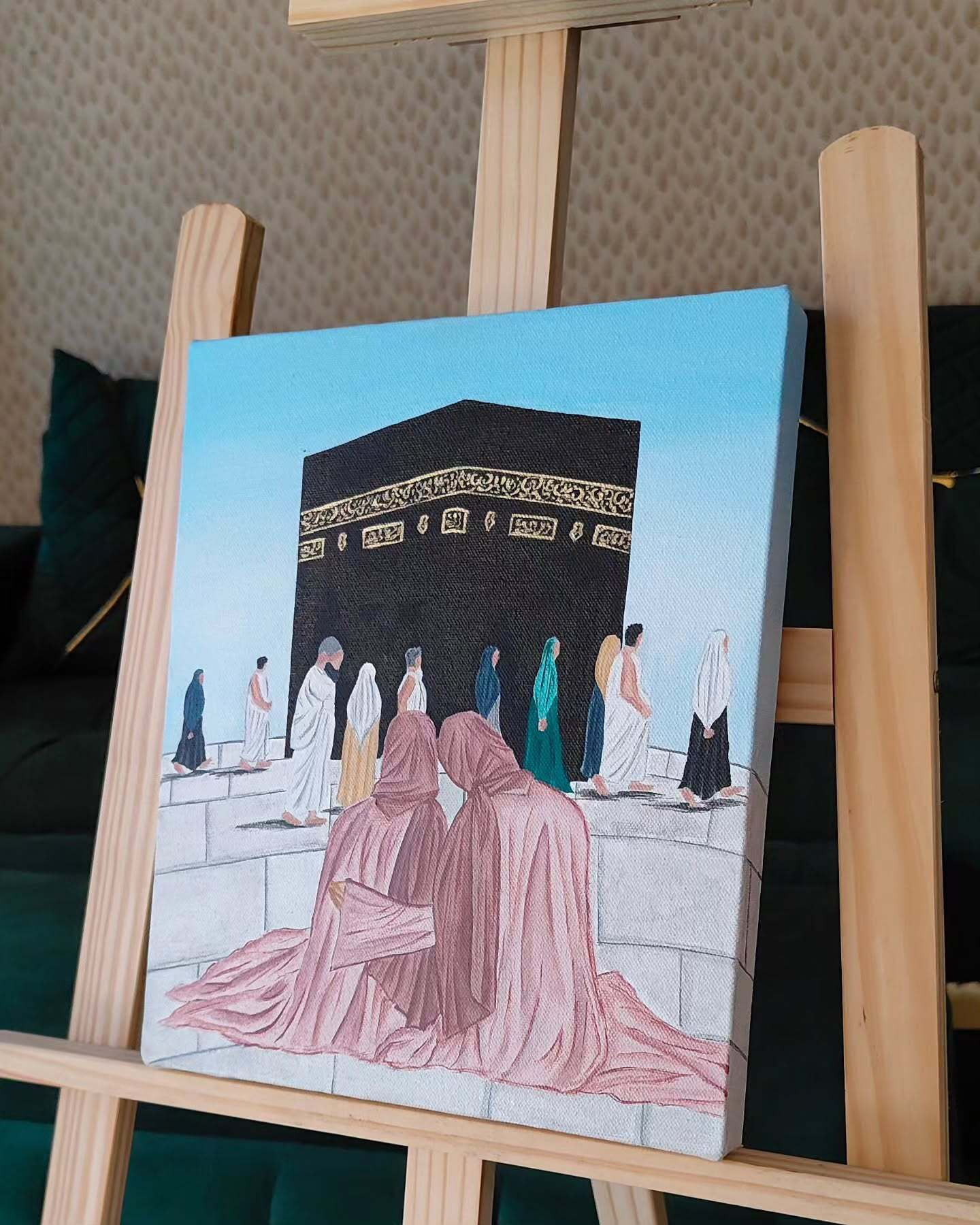 This heartfelt painting invites you into an intimate moment of peace before the Holy Kaaba. It beautifully captures not just the iconic destination, but the personal, soul-stirring experience of being there.