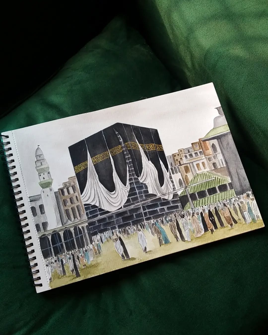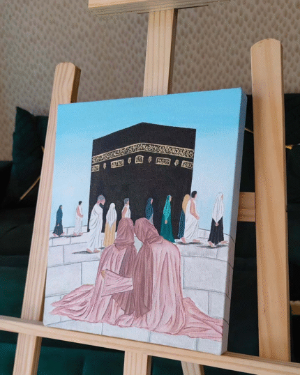 Rendered in a beautiful, expressive watercolor style, the scene feels alive and full of movement. The majestic Kaaba stands as a steadfast, serene anchor at the center, its golden band and flowing drapery painted with reverent detail. Swirling around it is a diverse river of pilgrims from every corner of the world, their collective presence creating a powerful sense of unity and purpose. The artist’s use of soft, earthy tones punctuated by hints of color perfectly conveys the humbling and awe-inspiring atmosphere of the holy sanctuary.