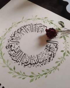 In Islamic art, circular calligraphy has always carried a unique symbolism—representing eternity, completeness, and the infinite nature of Allah’s words. This stunning artwork beautifully brings these elements together with a Quranic verse written in a perfect circular form, adorned with a wreath of green leaves. The result is a piece that is not only visually harmonious but also spiritually uplifting.